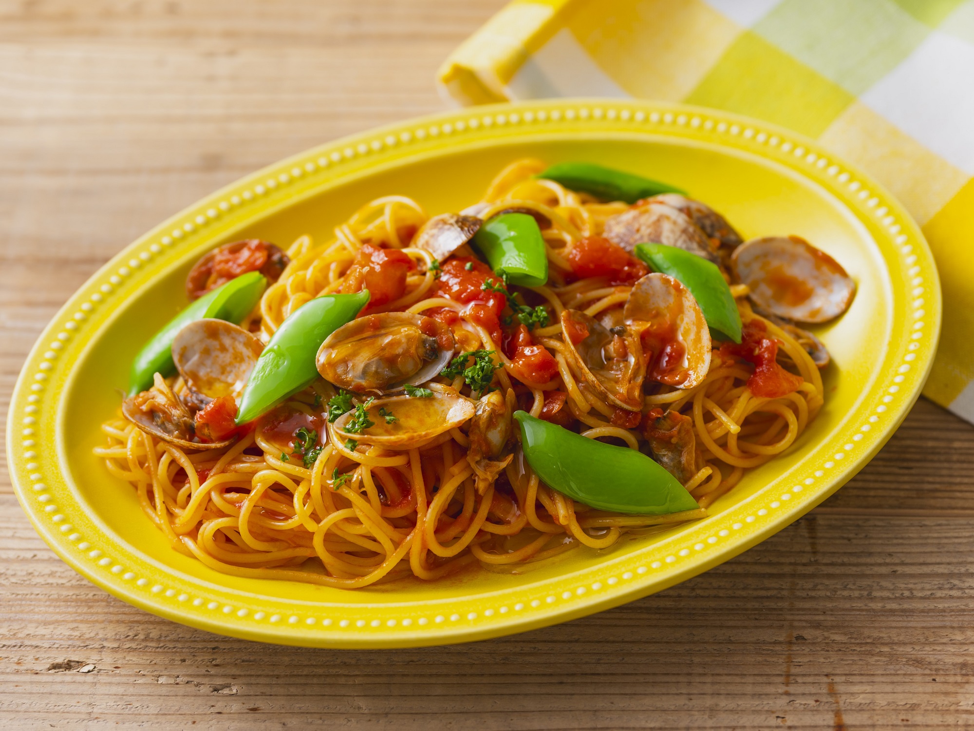 カラフルな「あさりとスナップエンドウのボンゴレ・ロッソ」